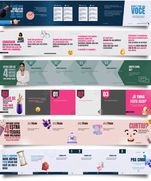 Foi pensando nessa premissa simples que eu criei o PACK CARROSSEL COM COPY. Ele é um kit de templates que vai te ajudar a criar postagens tipo carrossel incríveis.